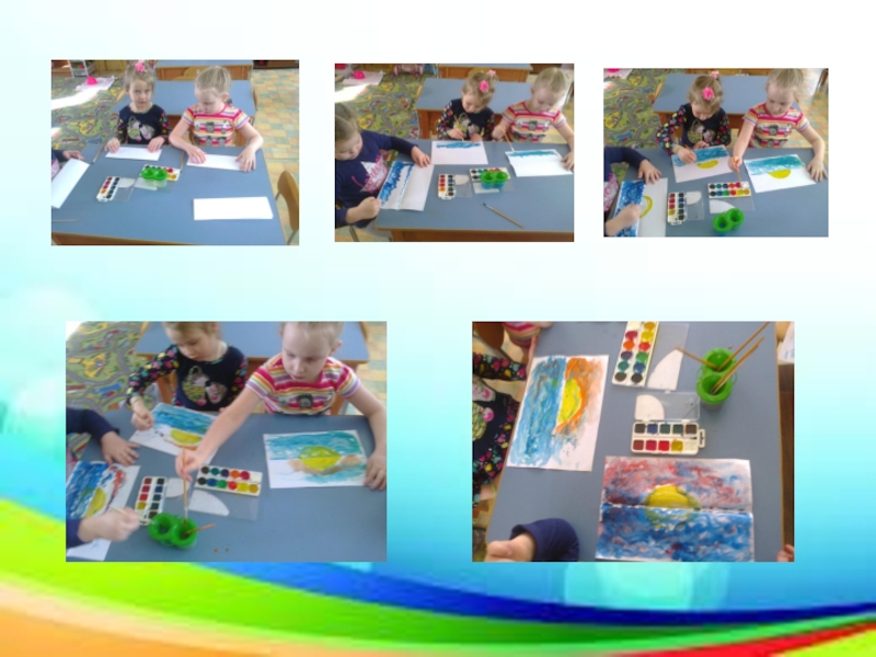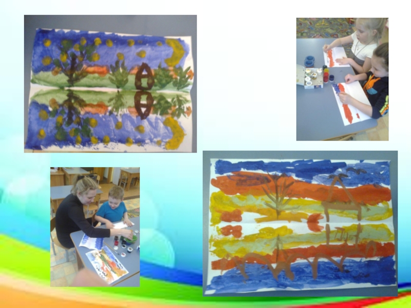 детям, что цвет обладает удивительными свойствами, а строй цветовых сочетаний воздействует на нас определенным образом. Продолжать воспитывать эстетические чувства детей, учить создавать пейзажи методом монотипии.