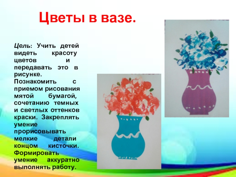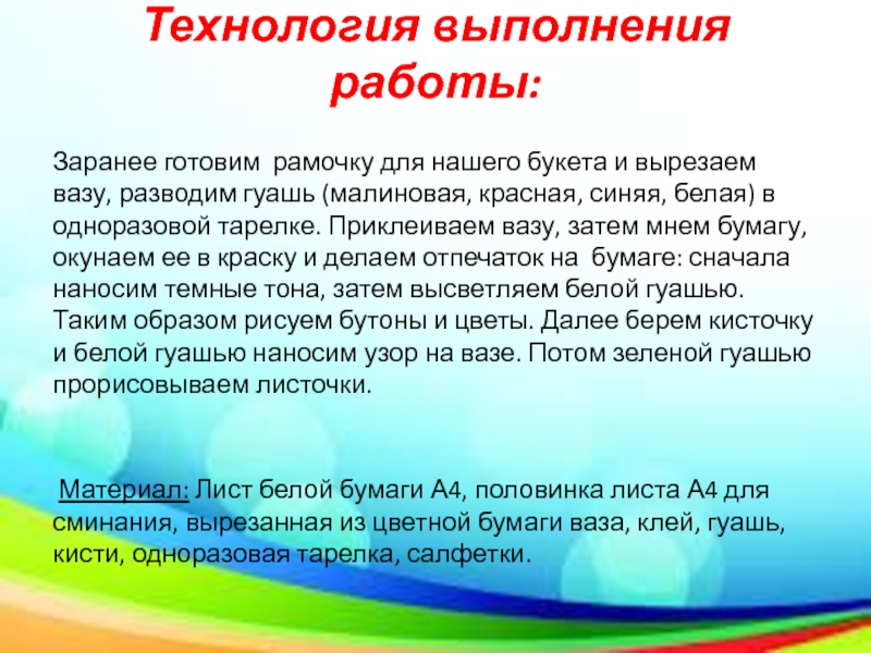 Материал: Лист белой бумаги А4, половинка листа А4 для сминания, вырезанная из цветной бумаги ваза, клей, гуашь, кисти, одноразовая тарелка, салфетки.