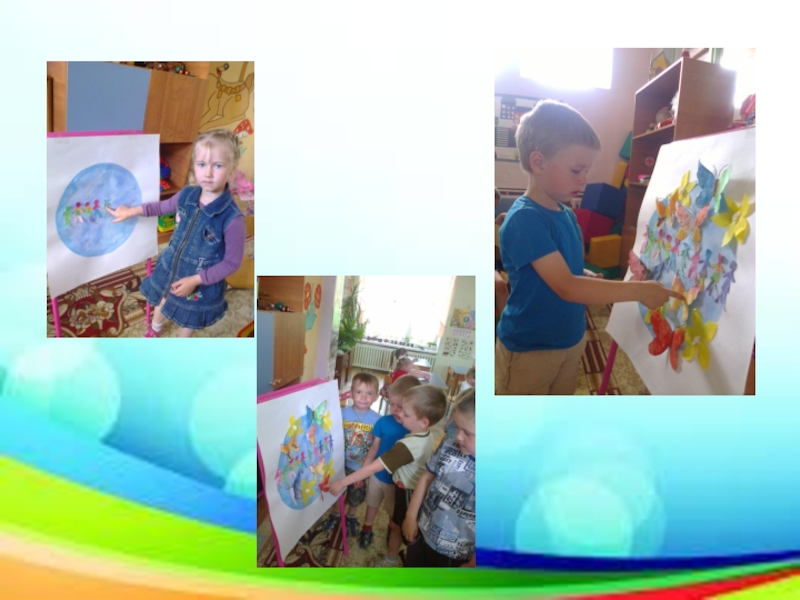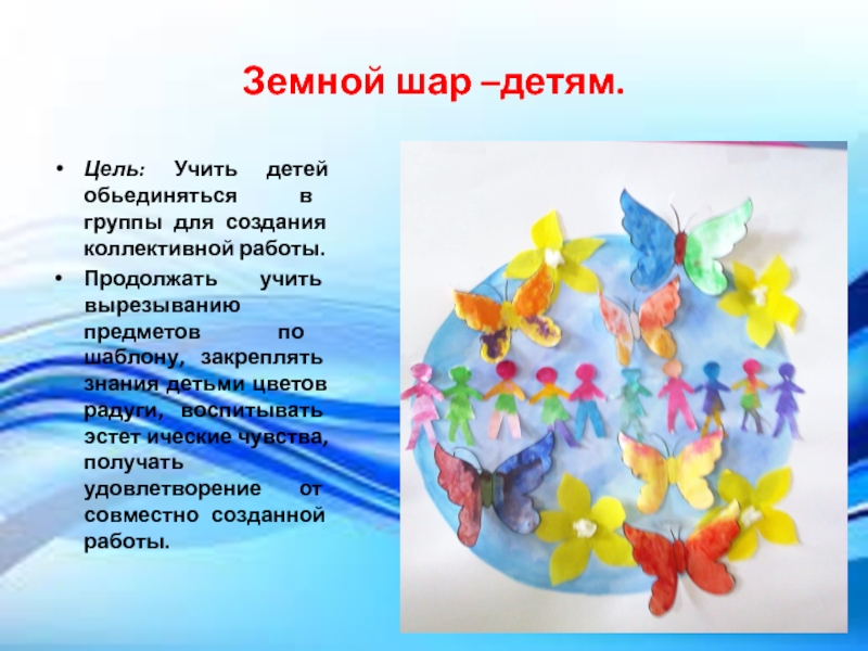 круг и вместе с детьми акварельными красками губкой наносим голубой фон планеты Земля – такой она видна из космоса. Из сложенной пополам бумаги ребята вырезают силуэты детей, раскрашивают их в цвета радуги. Затем таким же образом вырезают бабочек и цветы. Раскрашивают акварельными красками и украшают нашу планету.