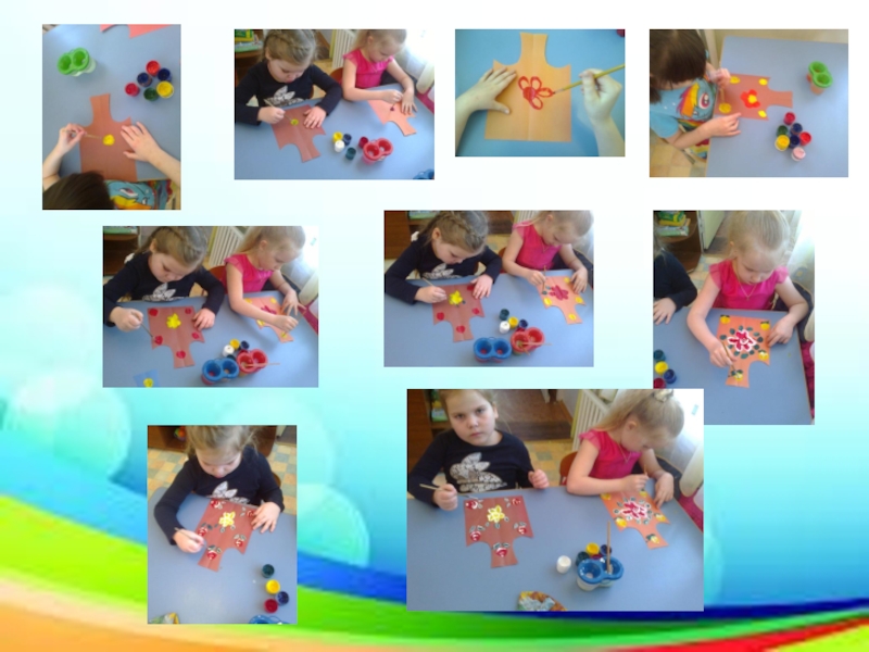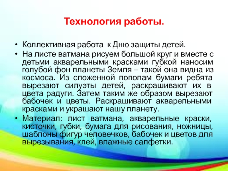 Материал: лист ватмана, акварельные краски, кисточки, губки, бумага для рисования, ножницы, шаблоны фигур человечков, бабочек и цветов для вырезывания, клей, влажные салфетки.