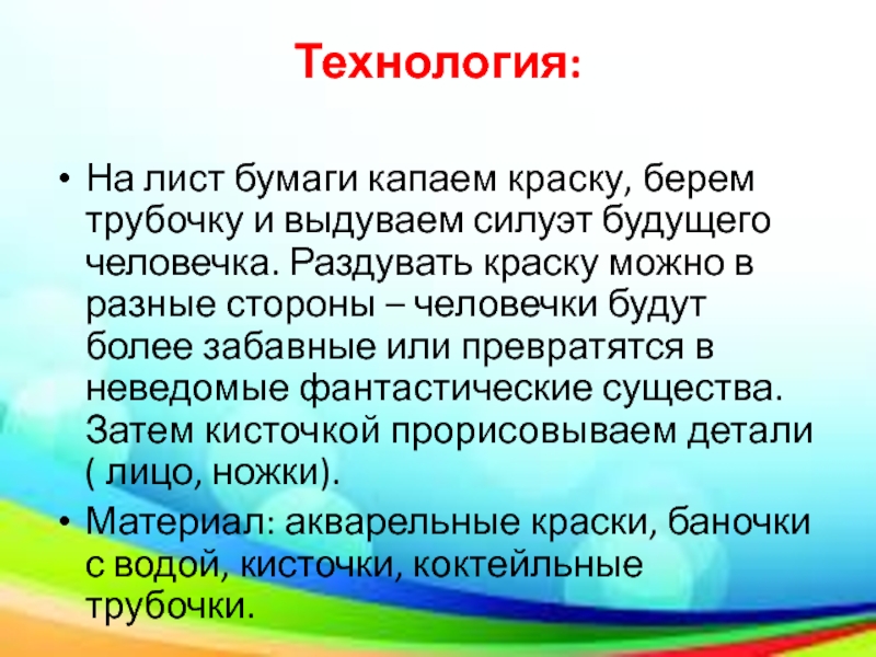 Материал: акварельные краски, баночки с водой, кисточки, коктейльные трубочки.