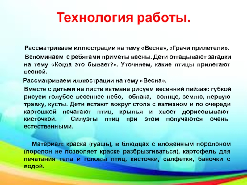 Материал: краска (гуашь), в блюдцах с вложенным поролоном (поролон не позволяет краске разбрызгиваться), картофель для печатания тела и головы птиц, кисточки, салфетки, баночки с водой.