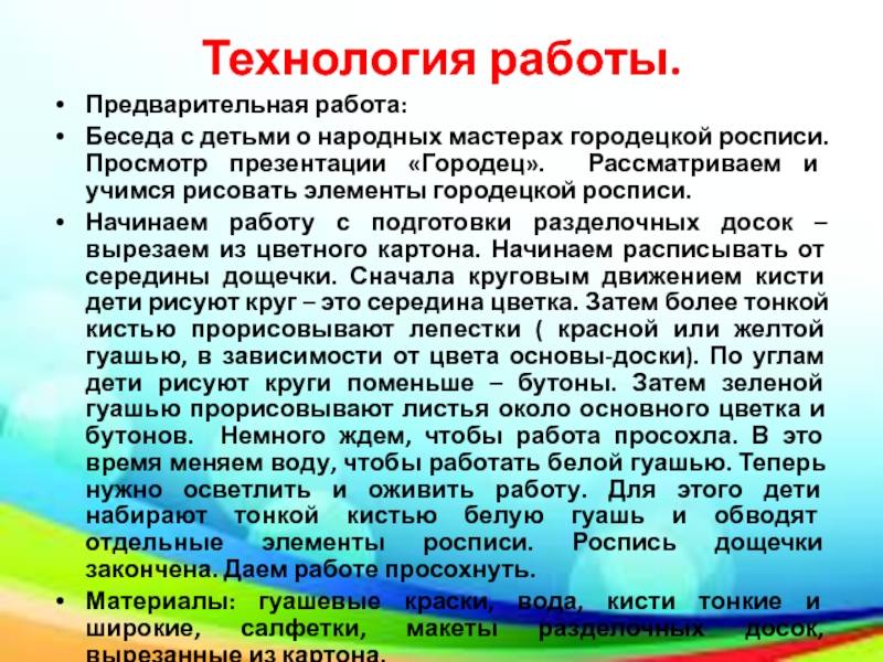 Начинаем работу с подготовки разделочных досок –вырезаем из цветного картона. Начинаем расписывать от середины дощечки. Сначала круговым движением кисти дети рисуют круг – это середина цветка. Затем более тонкой кистью прорисовывают лепестки ( красной или желтой гуашью, в зависимости от цвета основы-доски). По углам дети рисуют круги поменьше – бутоны. Затем зеленой гуашью прорисовывают листья около основного цветка и бутонов. Немного ждем, чтобы работа просохла. В это время меняем воду, чтобы работать белой гуашью. Теперь нужно осветлить и оживить работу. Для этого дети набирают тонкой кистью белую гуашь и обводят отдельные элементы росписи. Роспись дощечки закончена. Даем работе просохнуть.