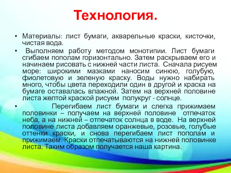 монотипии. Лист бумаги сгибаем пополам горизонтально. Затем раскрываем его и начинаем рисовать с нижней части листа. Сначала рисуем море: широкими мазками наносим синюю, голубую, фиолетовую и зеленую краску. Воды нужно набирать много, чтобы цвета переходили один в другой и краска на бумаге оставалась влажной. Затем на верхней половине листа желтой краской рисуем полукруг - солнце.