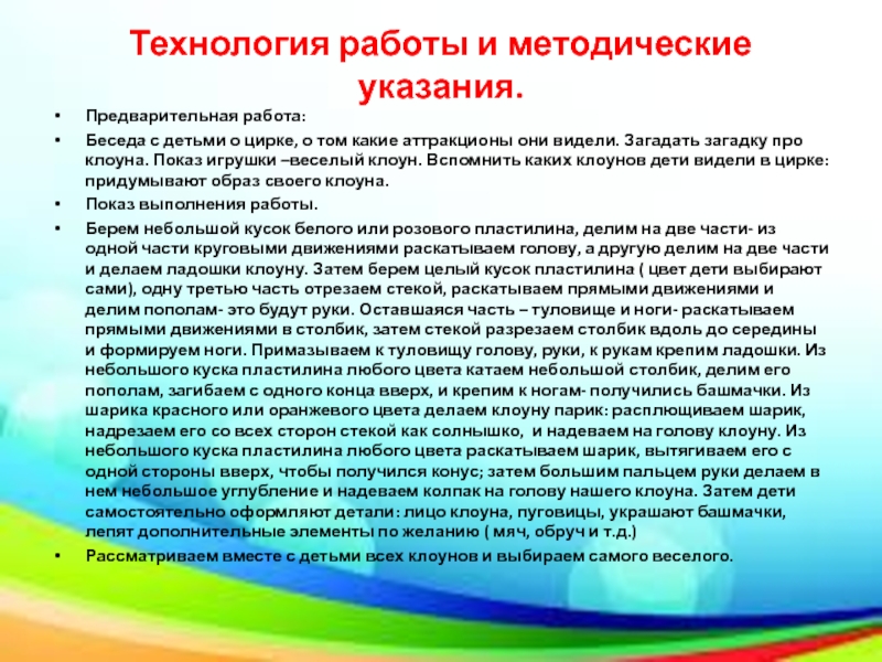 Берем небольшой кусок белого или розового пластилина, делим на две части- из одной части круговыми движениями раскатываем голову, а другую делим на две части и делаем ладошки клоуну. Затем берем целый кусок пластилина ( цвет дети выбирают сами), одну третью часть отрезаем стекой, раскатываем прямыми движениями и делим пополам- это будут руки. Оставшаяся часть – туловище и ноги- раскатываем прямыми движениями в столбик, затем стекой разрезаем столбик вдоль до середины и формируем ноги. Примазываем к туловищу голову, руки, к рукам крепим ладошки. Из небольшого куска пластилина любого цвета катаем небольшой столбик, делим его пополам, загибаем с одного конца вверх, и крепим к ногам- получились башмачки. Из шарика красного или оранжевого цвета делаем клоуну парик: расплющиваем шарик, надрезаем его со всех сторон стекой как солнышко, и надеваем на голову клоуну. Из небольшого куска пластилина любого цвета раскатываем шарик, вытягиваем его с одной стороны вверх, чтобы получился конус; затем большим пальцем руки делаем в нем небольшое углубление и надеваем колпак на голову нашего клоуна. Затем дети самостоятельно оформляют детали: лицо клоуна, пуговицы, украшают башмачки, лепят дополнительные элементы по желанию ( мяч, обруч и т.д.)