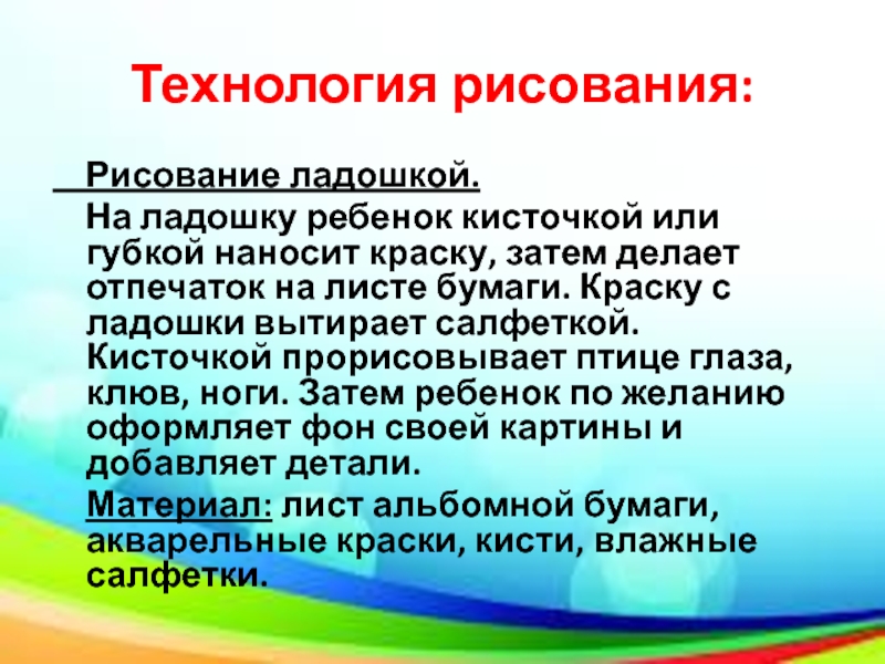 губкой наносит краску, затем делает отпечаток на листе бумаги. Краску с ладошки вытирает салфеткой. Кисточкой прорисовывает птице глаза, клюв, ноги. Затем ребенок по желанию оформляет фон своей картины и добавляет детали.