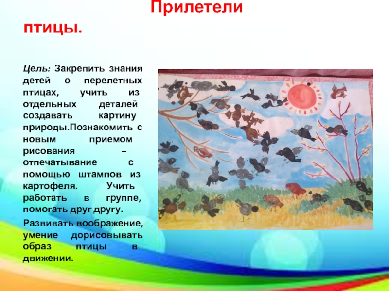 Цель: Закрепить знания детей о перелетных птицах, учить из отдельных деталей создавать картину природы.Познакомить с новым приемом рисования – отпечатывание с помощью штампов из картофеля. Учить работать в группе, помогать друг другу.