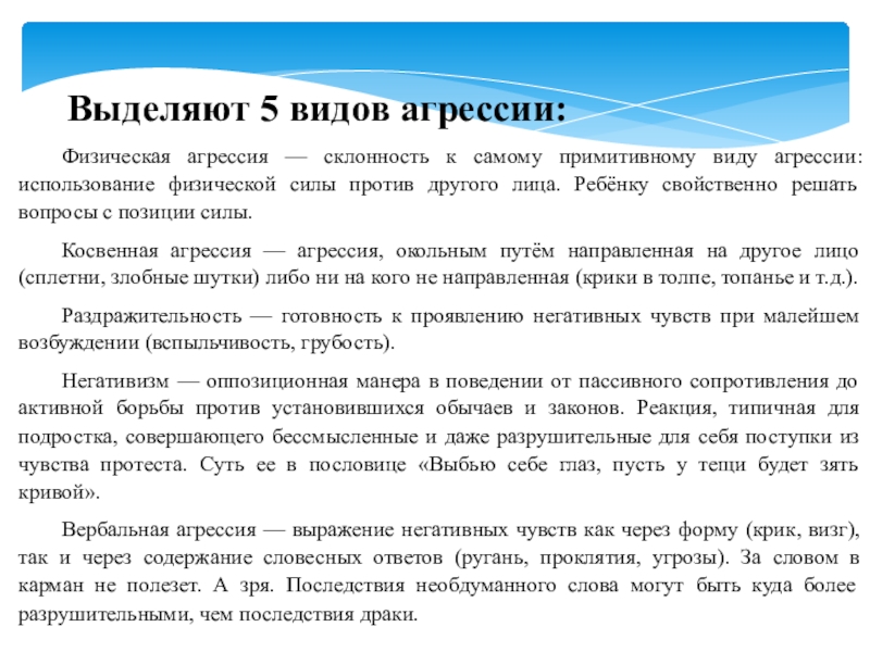 виду агрессии: использование физической силы против другого лица. Ребёнку свойственно решать вопросы с позиции силы.