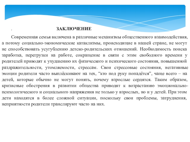 Современная семья включена в различные механизмы общественного взаимодействия, а потому социально-экономические катаклизмы, происходящие в нашей стране, не могут не способствовать усугублению детско-родительских отношений. Необходимость поиска заработка, перегрузки на работе, сокращение в связи с этим свободного времени у родителей приводят к ухудшению их физического и психического состояния, повышенной раздражительности, утомляемости, стрессам. Свои стрессовые состояния, негативные эмоции родители часто выплёскивают на тех, “кто под руку попадётся”, чаще всего – на детей, которые обычно не могут понять, почему взрослые сердятся. Таким образом, кризисные обострения в развитии общества приводят к возрастанию эмоционально-психологического и социального напряжения не только у взрослых, но и у детей. При этом дети находятся в более сложной ситуации, поскольку свои проблемы, затруднения, неприятности родители транслируют часто на них.