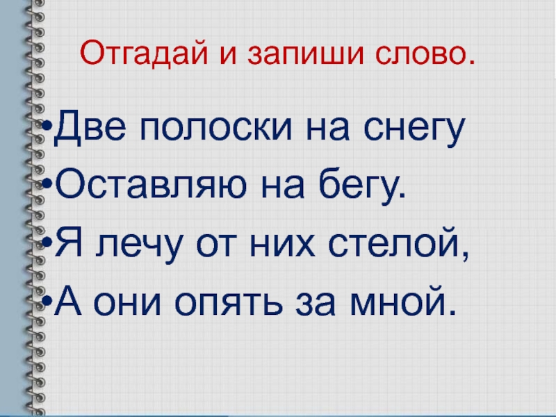Отгадай и запиши слово.Две полоски на снегуОставляю на бегу.Я лечу от них стелой,А они опять за мной.