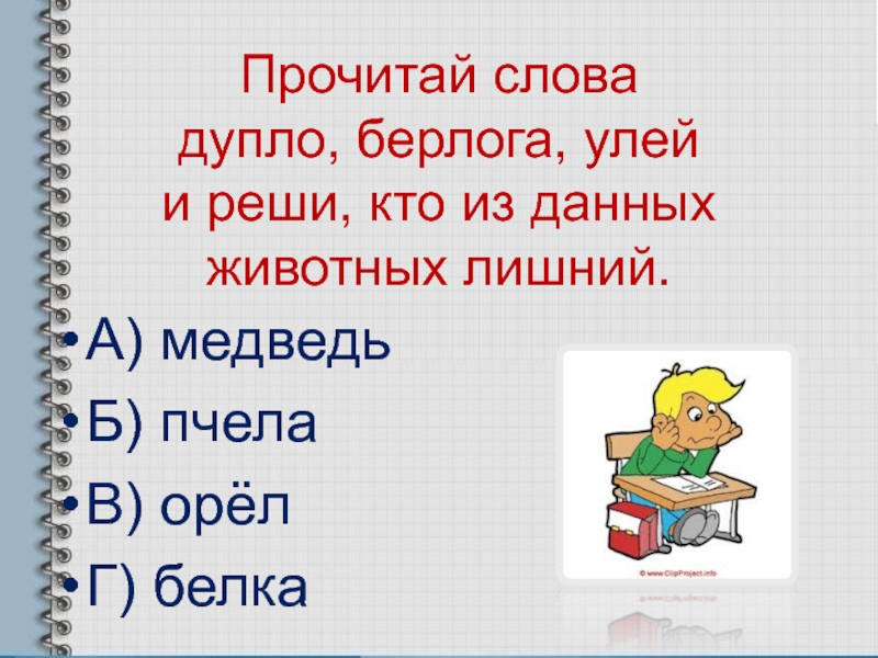 Прочитай слова дупло, берлога, улей и реши, кто из данных животных лишний.  А) медведьБ)