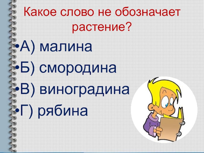 Какое слово не обозначает растение? А) малинаБ) смородинаВ) виноградинаГ) рябина