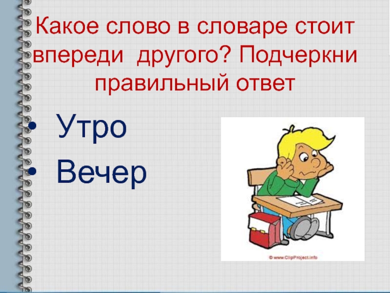 Какое слово в словаре стоит впереди другого? Подчеркни правильный ответ Утро Вечер