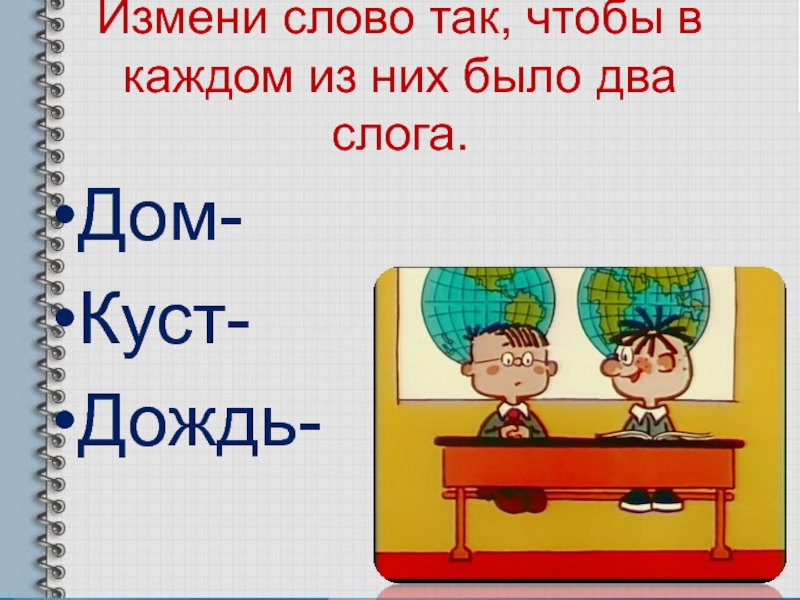 Слайд 3Измени слово так, чтобы в каждом из них было два слога.
