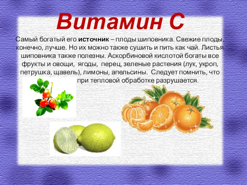 Но их можно также сушить и пить как чай. Листья шиповника также полезны. Аскорбиновой кислотой богаты все фрукты и овощи, ягоды, перец, зеленые растения (лук, укроп, петрушка, щавель), лимоны, апельсины. Следует помнить, что витамин С при тепловой обработке разрушается.