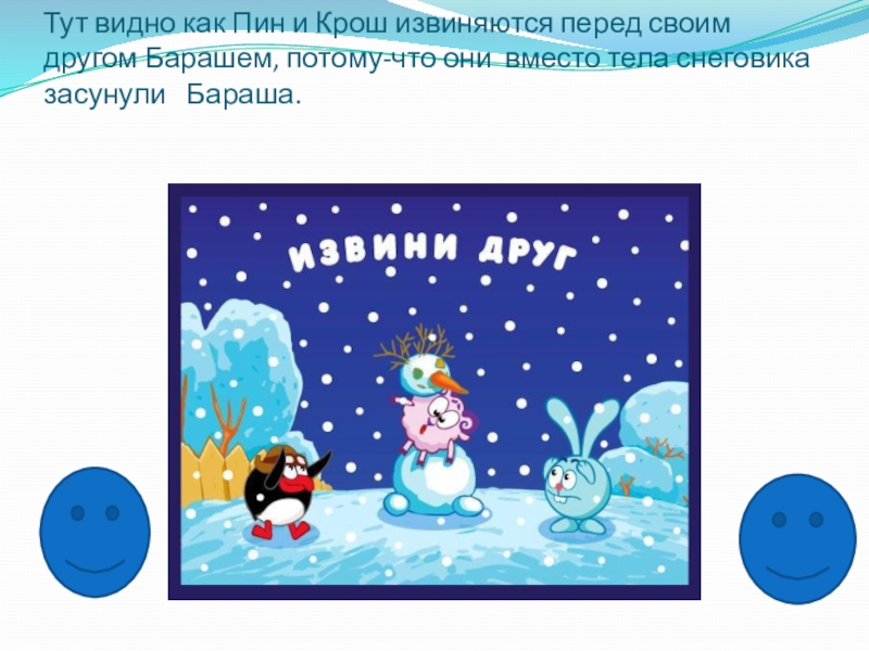 Тут видно как Пин и Крош извиняются перед своим другом Барашем, потому-что они вместо тела снеговика