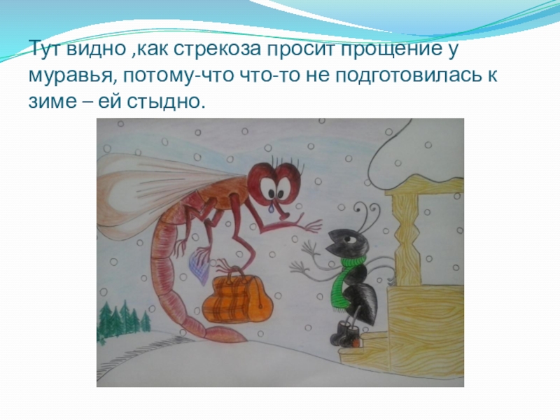 Тут видно ,как стрекоза просит прощение у муравья, потому-что что-то не подготовилась к зиме – ей стыдно.