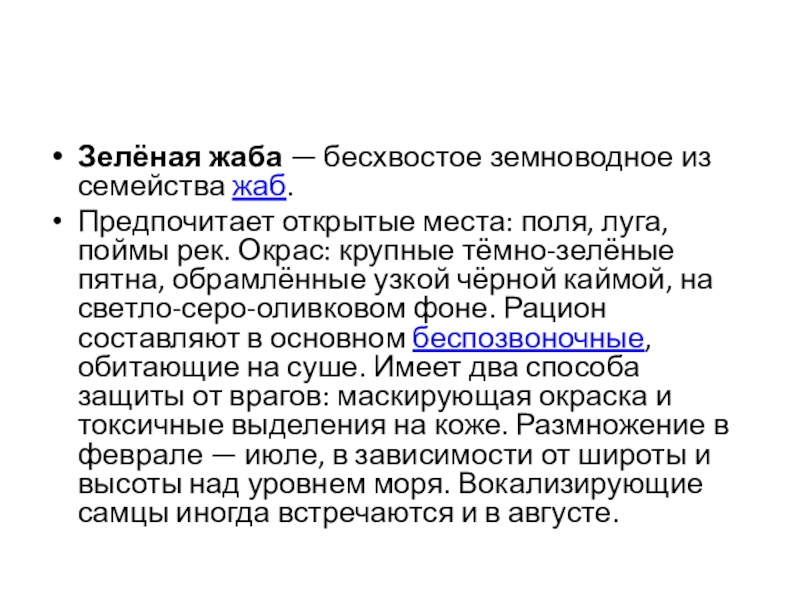 Слайд 2Зелёная жаба — бесхвостое земноводное из семейства жаб.