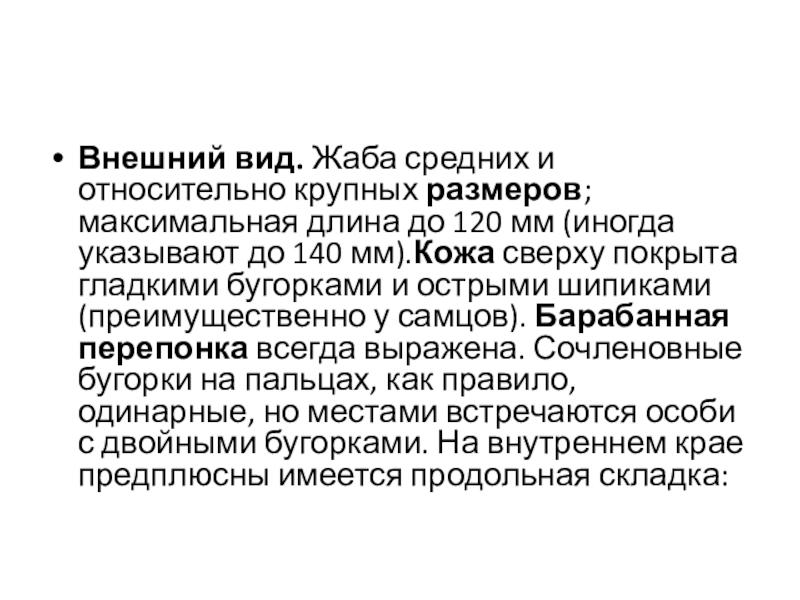 Слайд 3Внешний вид. Жаба средних и относительно крупных размеров; максимальная длина до 120 мм