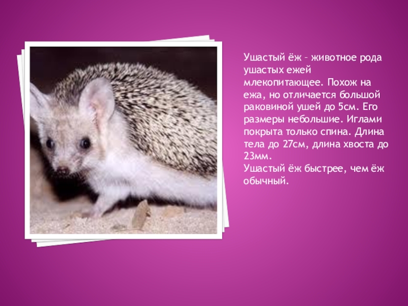 Слайд 5Ушастый ёж – животное рода ушастых ежей млекопитающее. Похож на ежа,