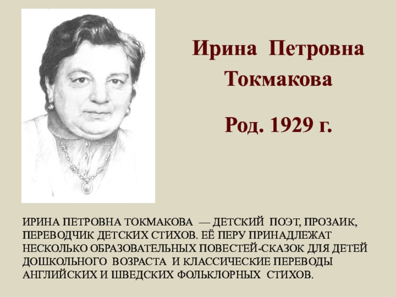 Слайд 18ИРИНА ПЕТРОВНА ТОКМАКОВА — ДЕТСКИЙ ПОЭТ, ПРОЗАИК, ПЕРЕВОДЧИК ДЕТСКИХ СТИХОВ. ЕЁ