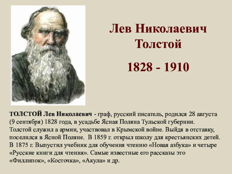 Толстой служил а армии, участвовал в Крымской войне. Выйдя в отставку, поселился в Ясной Поляне. В 1859 г. открыл школу для крестьянских детей. В 1875 г. Выпустил учебник для обучения чтению «Новая азбука» и четыре «Русские книги для чтения». Самые известные его рассказы это «Филлипок», «Косточка», «Акула» и др.