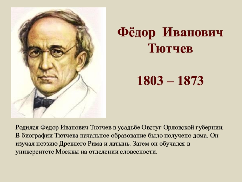 Орловской губернии. В биографии Тютчева начальное образование было получено дома. Он изучал поэзию Древнего Рима и латынь. Затем он обучался в университете Москвы на отделении словесности.
