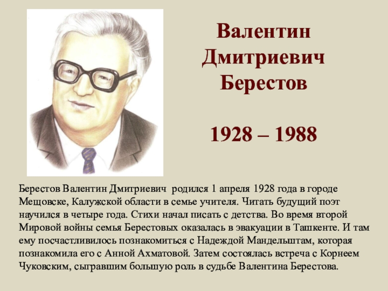 Берестов Валентин Дмитриевич родился 1 апреля 1928