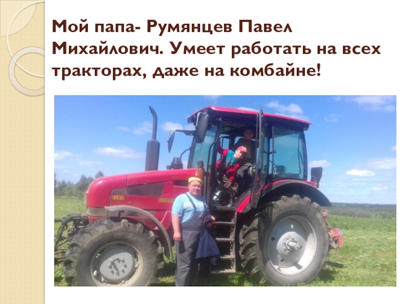 Слайд 4Мой папа- Румянцев Павел Михайлович. Умеет работать на всех тракторах, даже