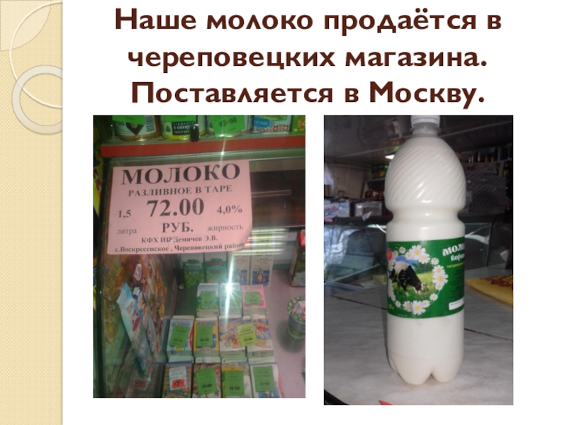 Слайд 6Наше молоко продаётся в череповецких магазина. Поставляется в Москву.