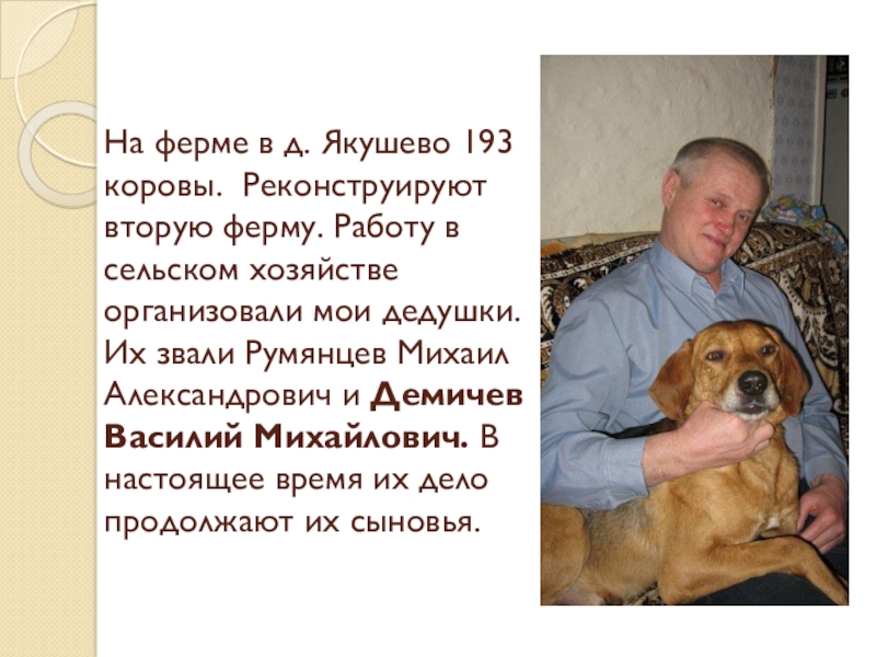 На ферме в д. Якушево 193 коровы. Реконструируют вторую ферму. Работу в сельском хозяйстве организовали мои дедушки.