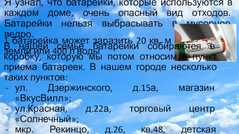 В нашей семье батарейки собираются в коробку, которую мы потом относим в пункт приема батареек. В нашем городе несколько таких пунктов: