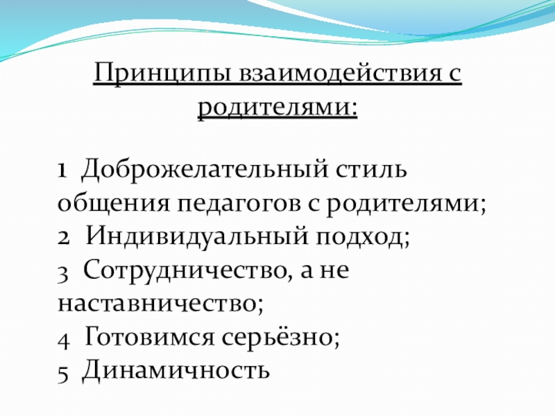 Принципы взаимодействия с родителями:1 Доброжелательный стиль    общения педагогов с родителями;2 Индивидуальный подход;3 Сотрудничество, а