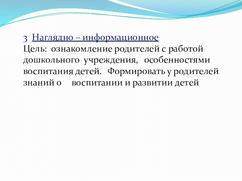 3 Наглядно – информационноеЦель: ознакомление родителей с 	работой 	дошкольного учреждения, 	особенностями воспитания детей. 	Формировать у родителей знаний