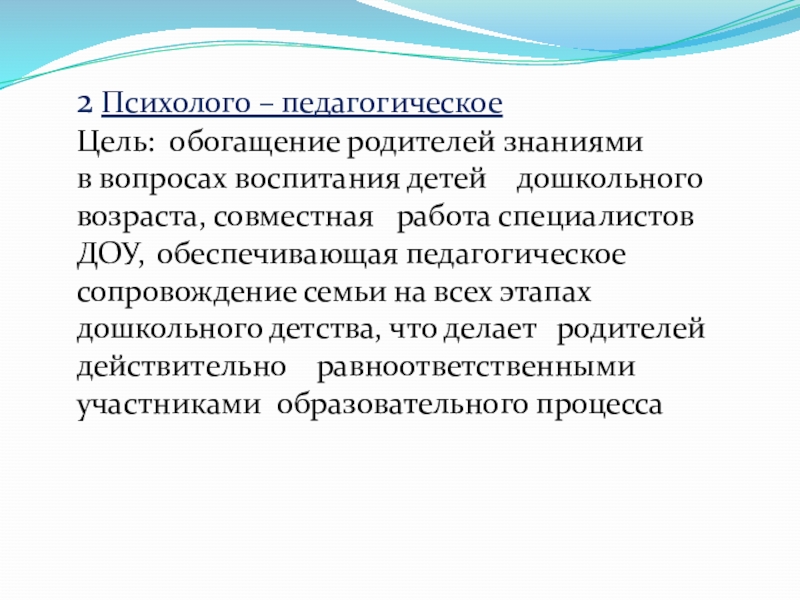 2 Психолого – педагогическоеЦель: обогащение родителей знаниями   	в вопросах воспитания детей 	дошкольного возраста, совместная 	работа