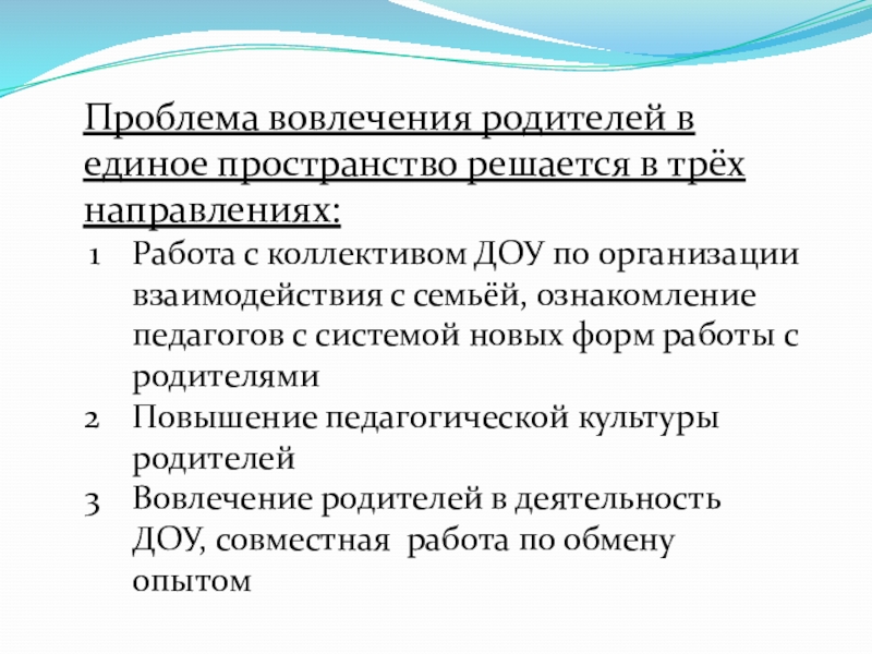 Слайд 3Проблема вовлечения родителей в единое пространство решается в трёх направлениях: