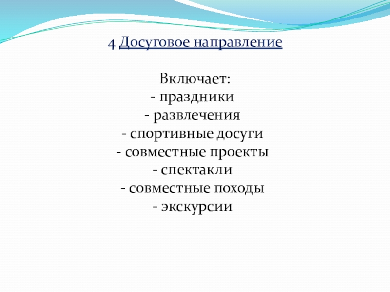 4 Досуговое направлениеВключает: праздники развлечения спортивные досуги совместные проекты спектакли совместные походы экскурсии