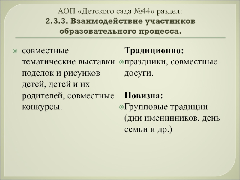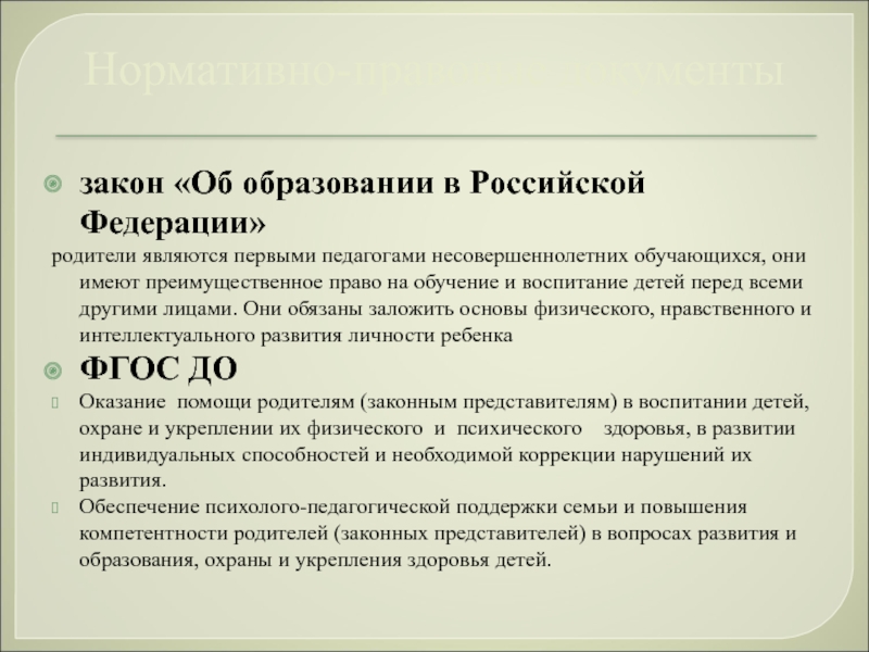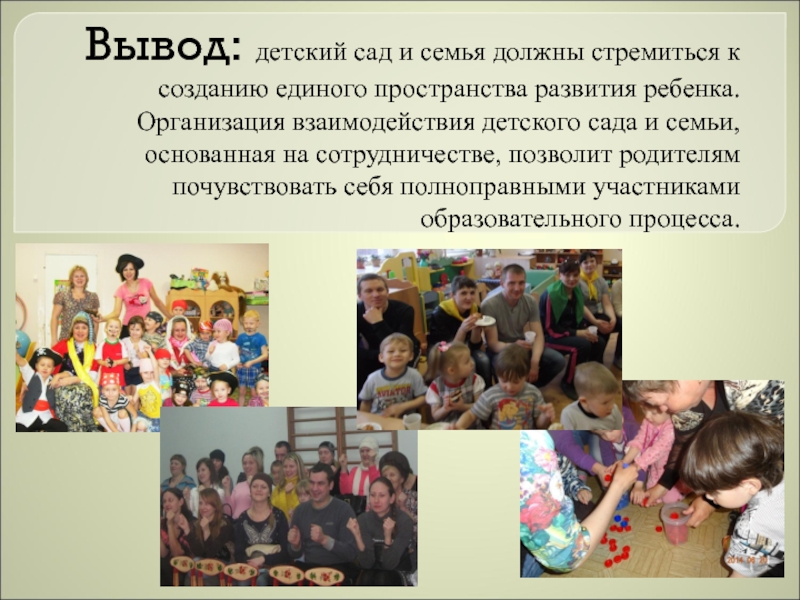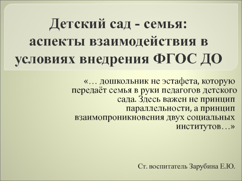 «… дошкольник не эстафета, которую передаёт семья в руки педагогов детского сада. Здесь важен не принцип параллельности, а принцип взаимопроникновения двух социальных институтов…»