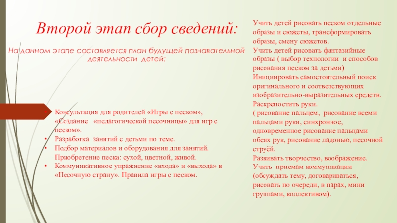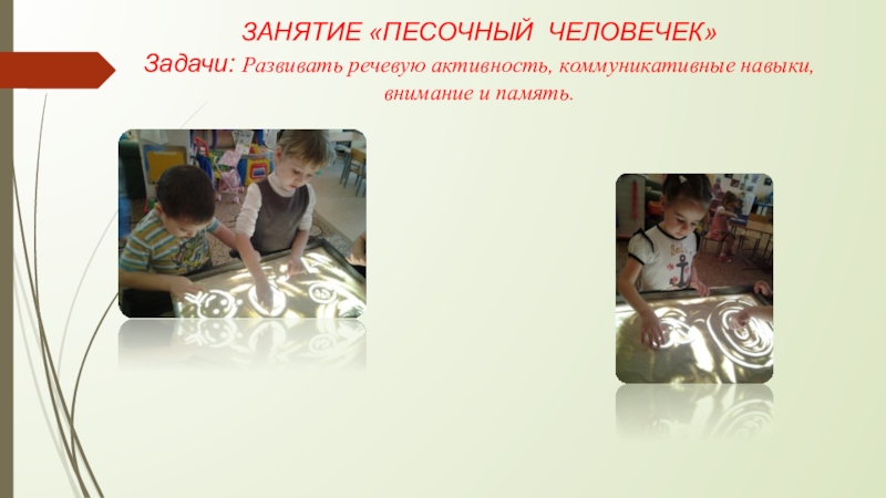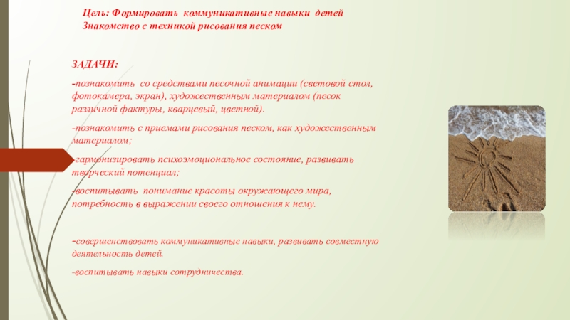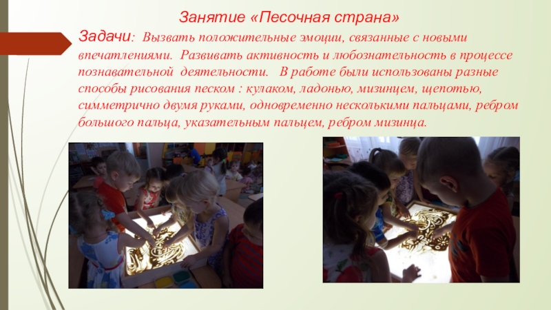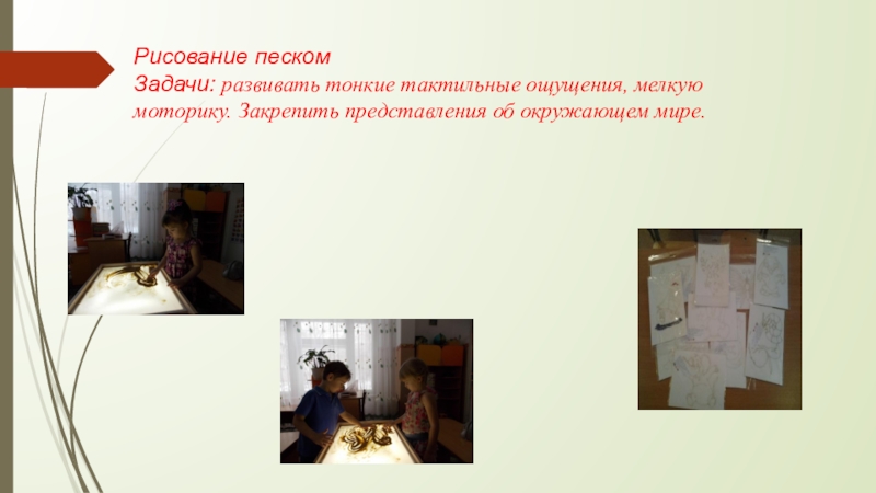 Учить детей рисовать песком отдельные образы и сюжеты, трансформировать образы, смену сюжетов.