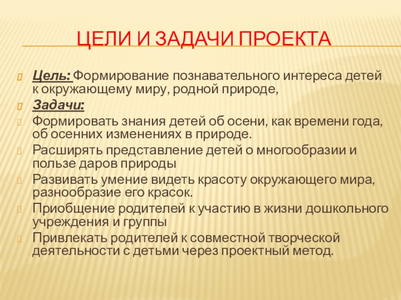 Цели и задачи проектаЦель: Формирование познавательного интереса детей к окружающему миру, родной природе, Задачи:Формировать знания детей об осени, как времени года, об осенних изменениях в природе.Расширять представление детей о многообразии и пользе даров природыРазвивать умение видеть