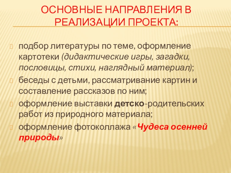 Основные направления в  реализации проекта: подбор литературы по теме, оформление картотеки (дидактические игры, загадки, пословицы, стихи, наглядный материал);беседы