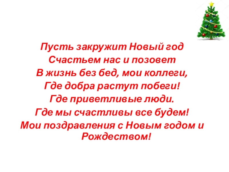Пусть закружит Новый годСчастьем нас и позоветВ жизнь без бед, мои коллеги,Где добра растут побеги!Где приветливые люди.Где