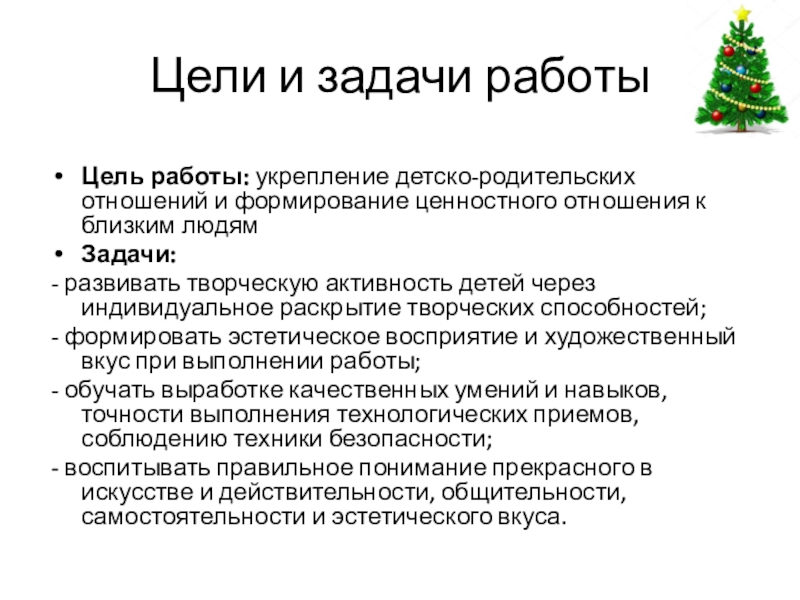 Цели и задачи работыЦель работы: укрепление детско-родительских отношений и формирование ценностного отношения к близким людямЗадачи:- развивать творческую