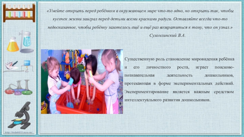 Существенную роль становление мировидения ребёнка и его личностного роста, играет поисково-познавательная деятельность дошкольников, протекающая в форме экспериментальных действий. Экспериментирование является важным средством интеллектуального развития дошкольников.