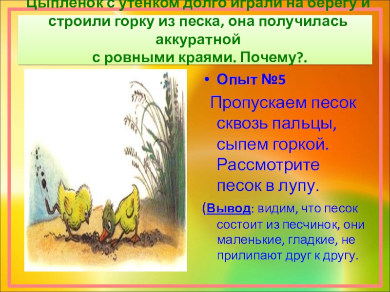 (Вывод: видим, что песок состоит из песчинок, они маленькие, гладкие, не прилипают друг к другу.