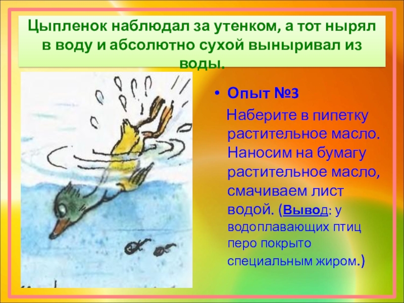 Наберите в пипетку растительное масло. Наносим на бумагу растительное масло, смачиваем лист водой. (Вывод: у водоплавающих птиц перо покрыто специальным жиром.)