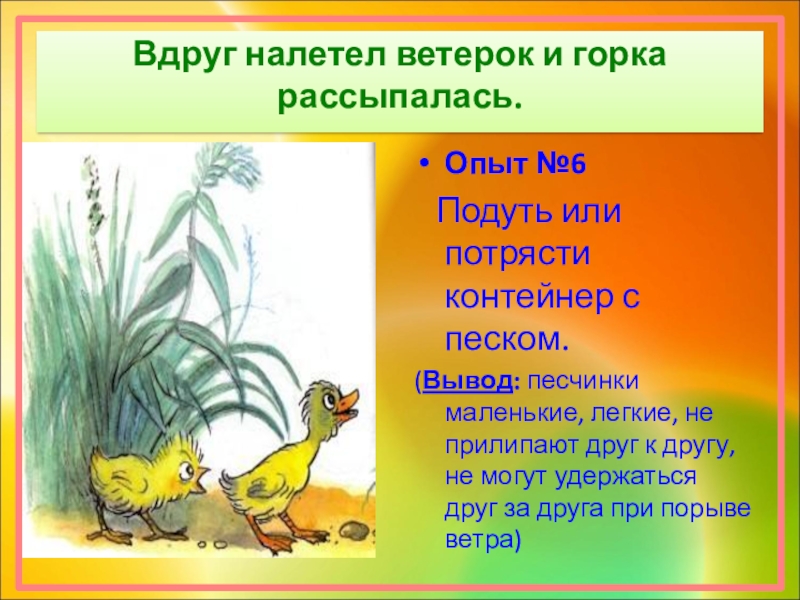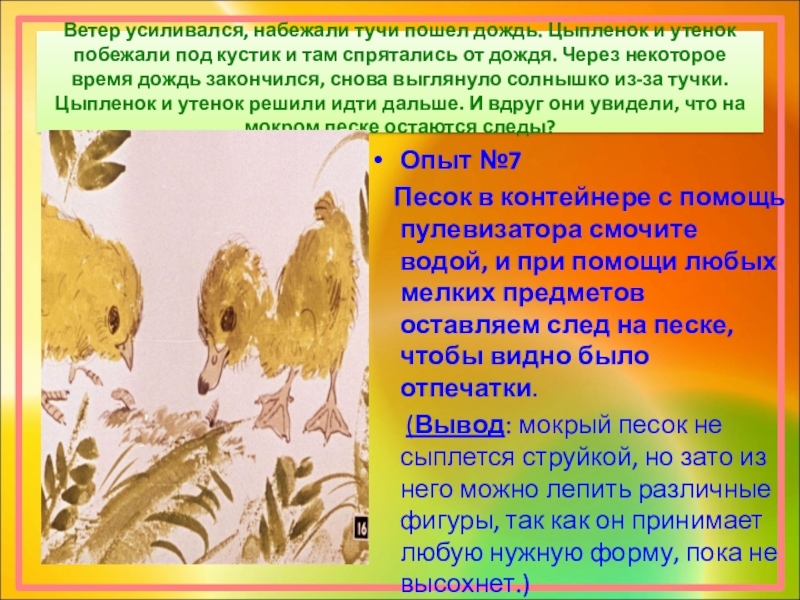 (Вывод: мокрый песок не сыплется струйкой, но зато из него можно лепить различные фигуры, так как он принимает любую нужную форму, пока не высохнет.)