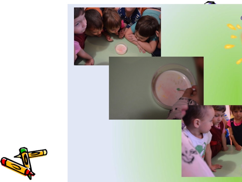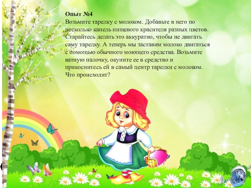 пищевого красителя разных цветов. Старайтесь делать это аккуратно, чтобы не двигать саму тарелку. А теперь мы заставим молоко двигаться с помощью обычного моющего средства. Возьмите ватную палочку, окуните ее в средство и прикоснитесь ей в самый центр тарелки с молоком. Что происходит?