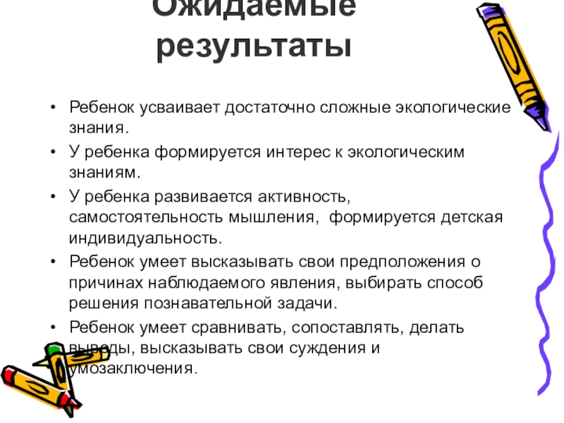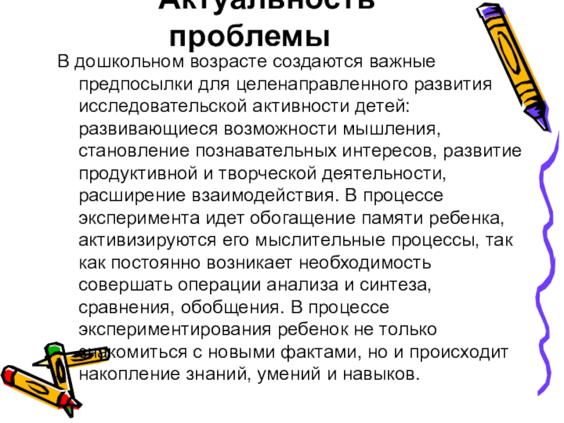 целенаправленного развития исследовательской активности детей: развивающиеся возможности мышления, становление познавательных интересов, развитие продуктивной и творческой деятельности, расширение взаимодействия. В процессе эксперимента идет обогащение памяти ребенка, активизируются его мыслительные процессы, так как постоянно возникает необходимость совершать операции анализа и синтеза, сравнения, обобщения. В процессе экспериментирования ребенок не только знакомиться с новыми фактами, но и происходит накопление знаний, умений и навыков.