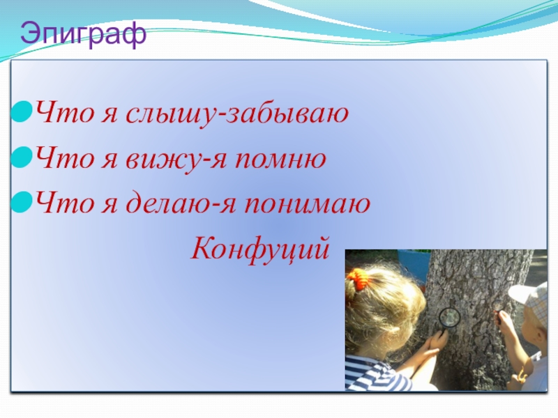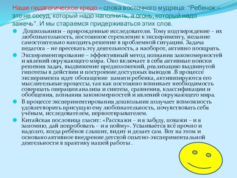 Китайская пословица гласит: «Расскажи – и я забуду, покажи – и я запомню, дай попробовать – и я пойму». Усваивается всё прочно и надолго, когда ребёнок слышит, видит и делает сам. Вот на этом и основано активное внедрение детской опытно-экспериментальной деятельности в практику нашей работы .